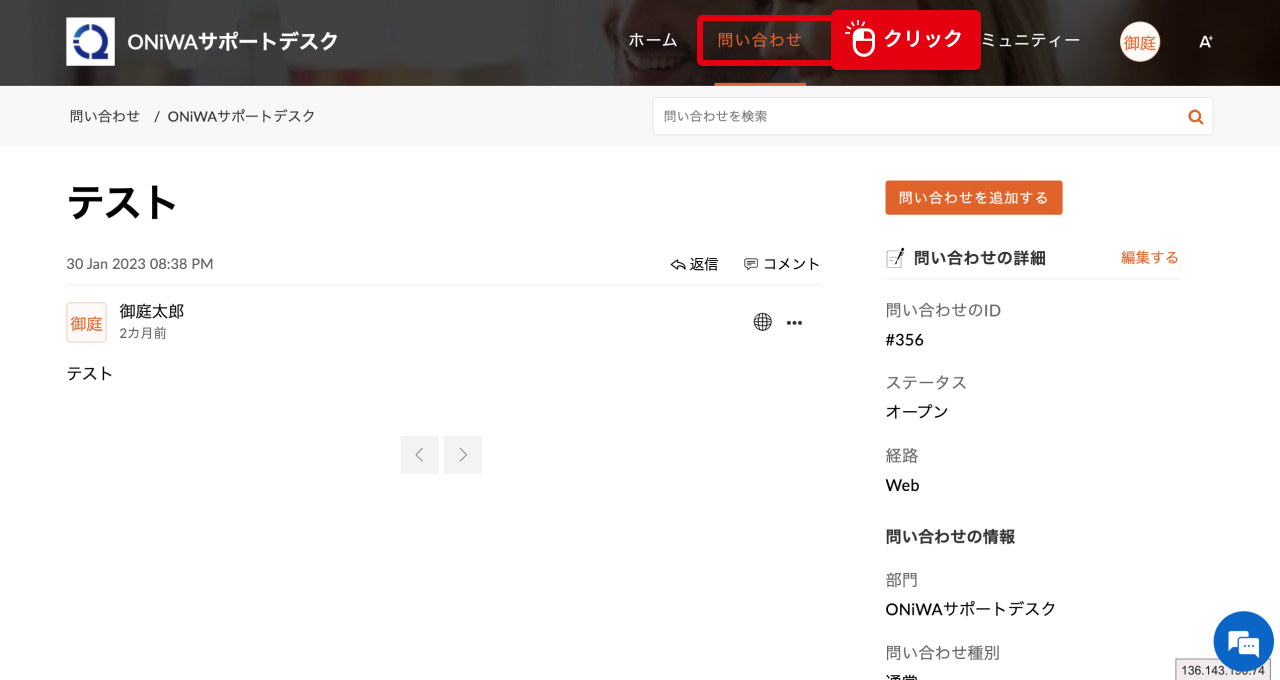 画面上部の「問い合わせ」をクリックしてください。
