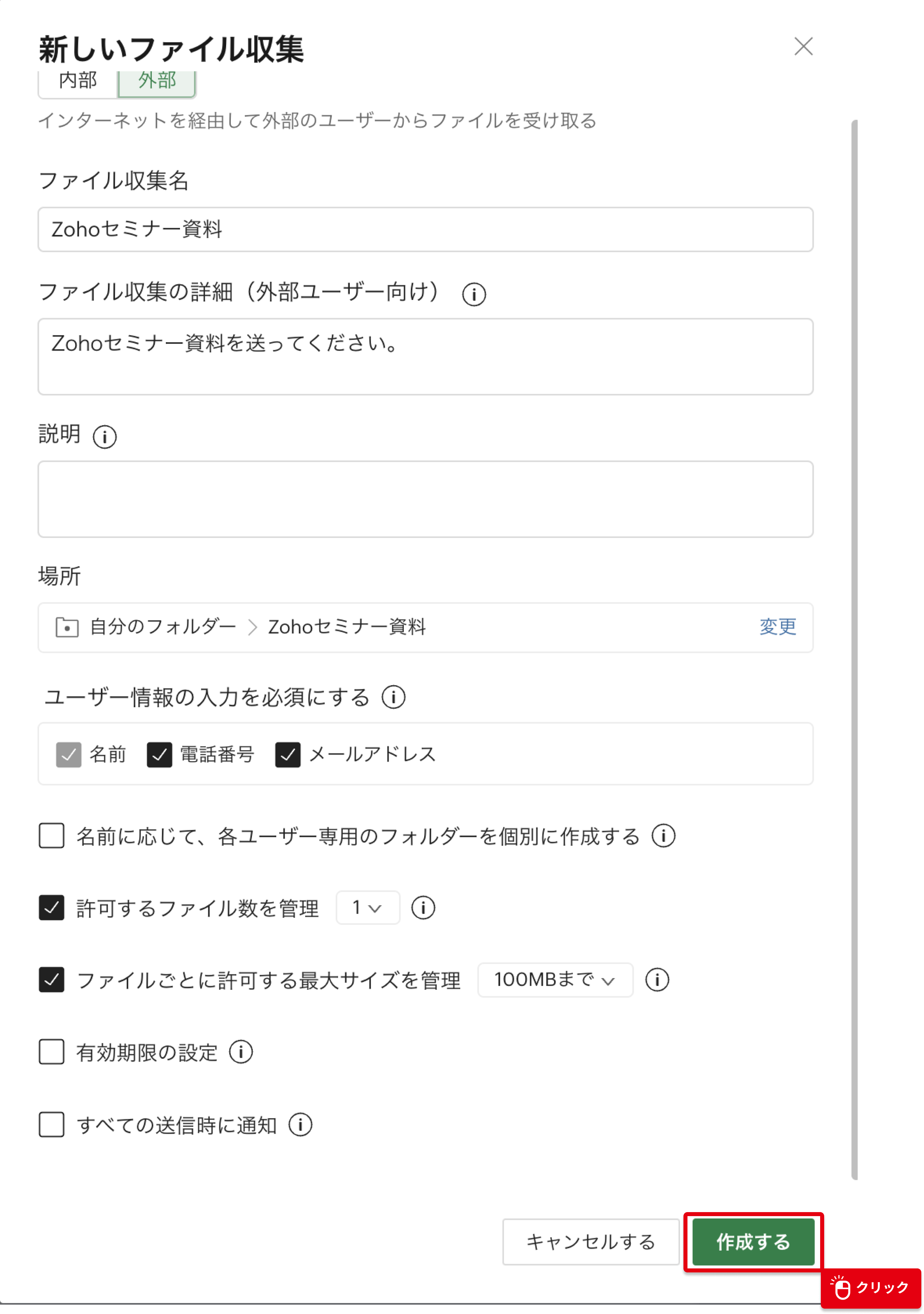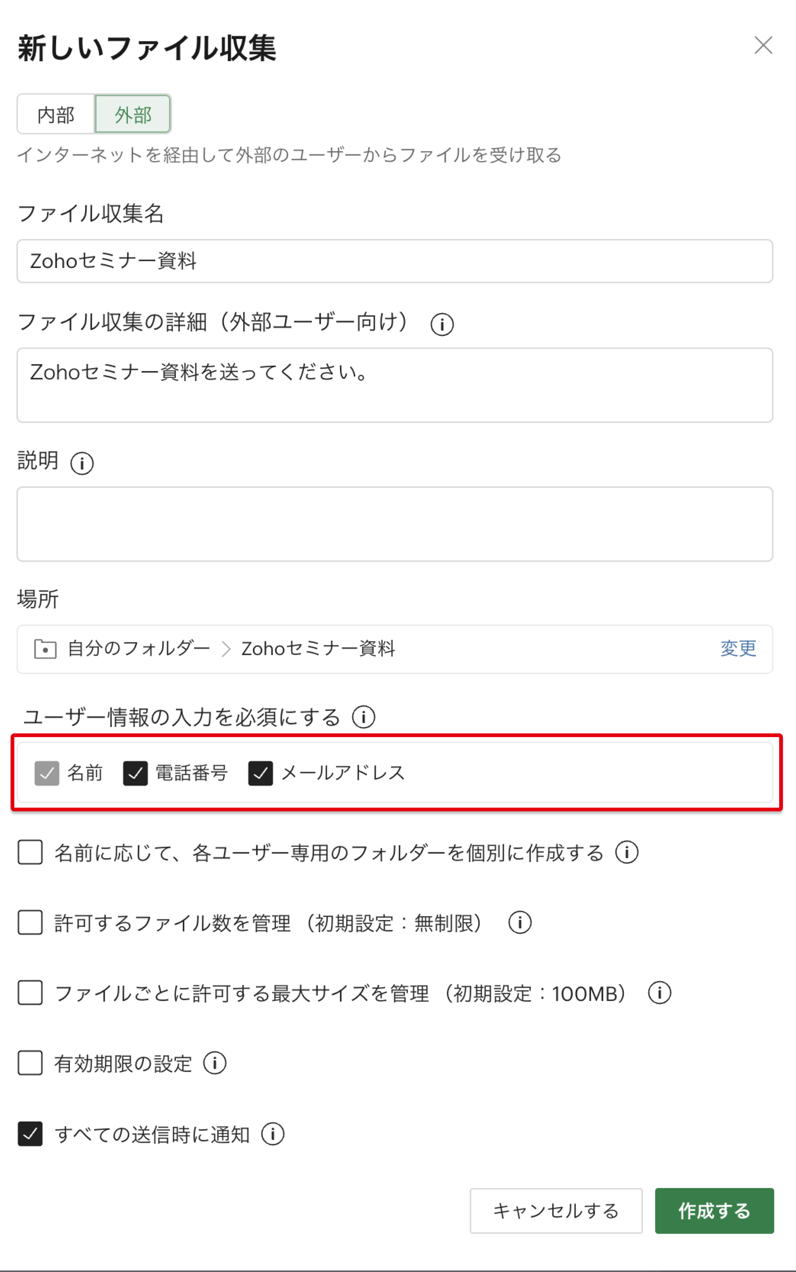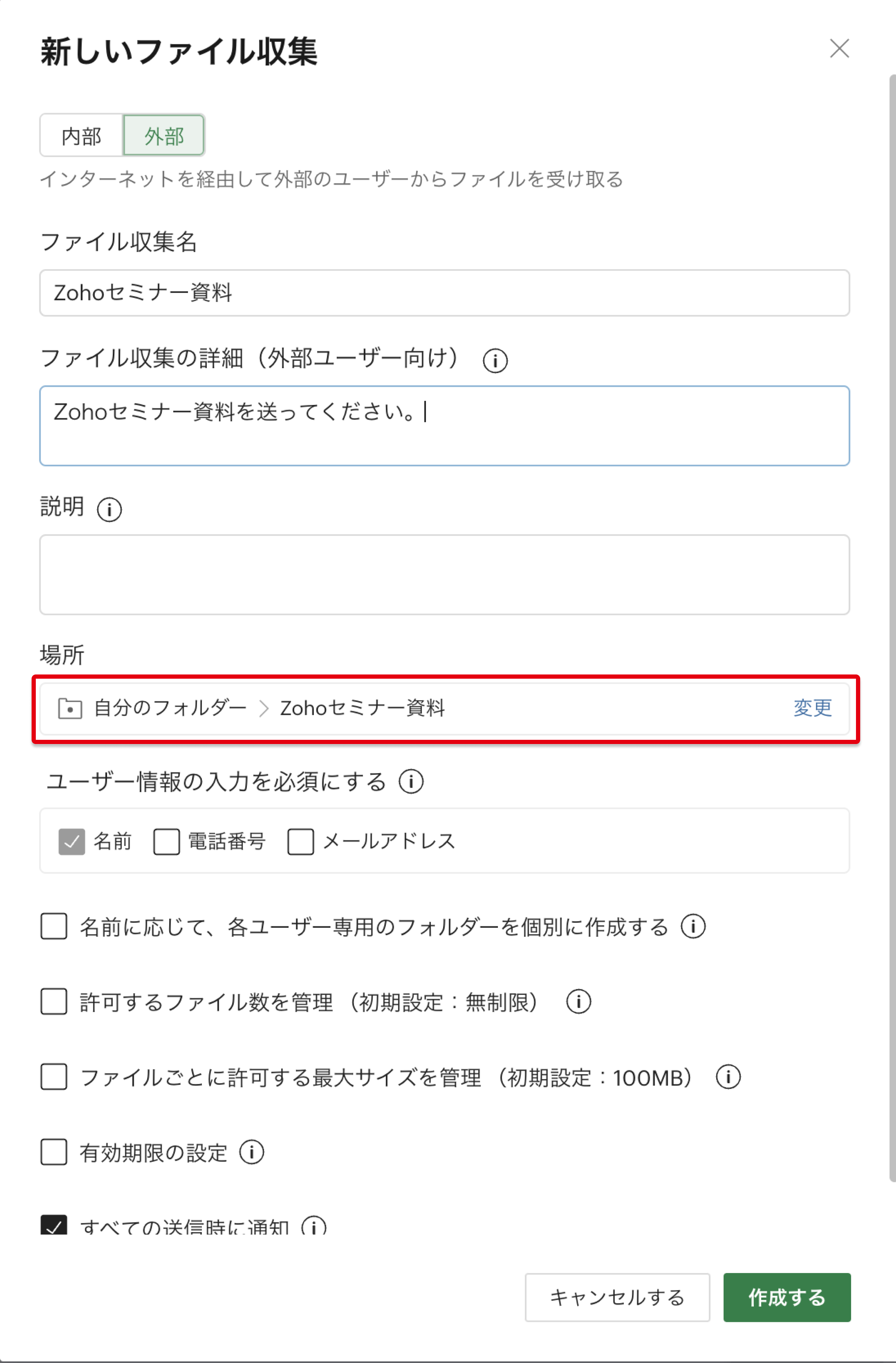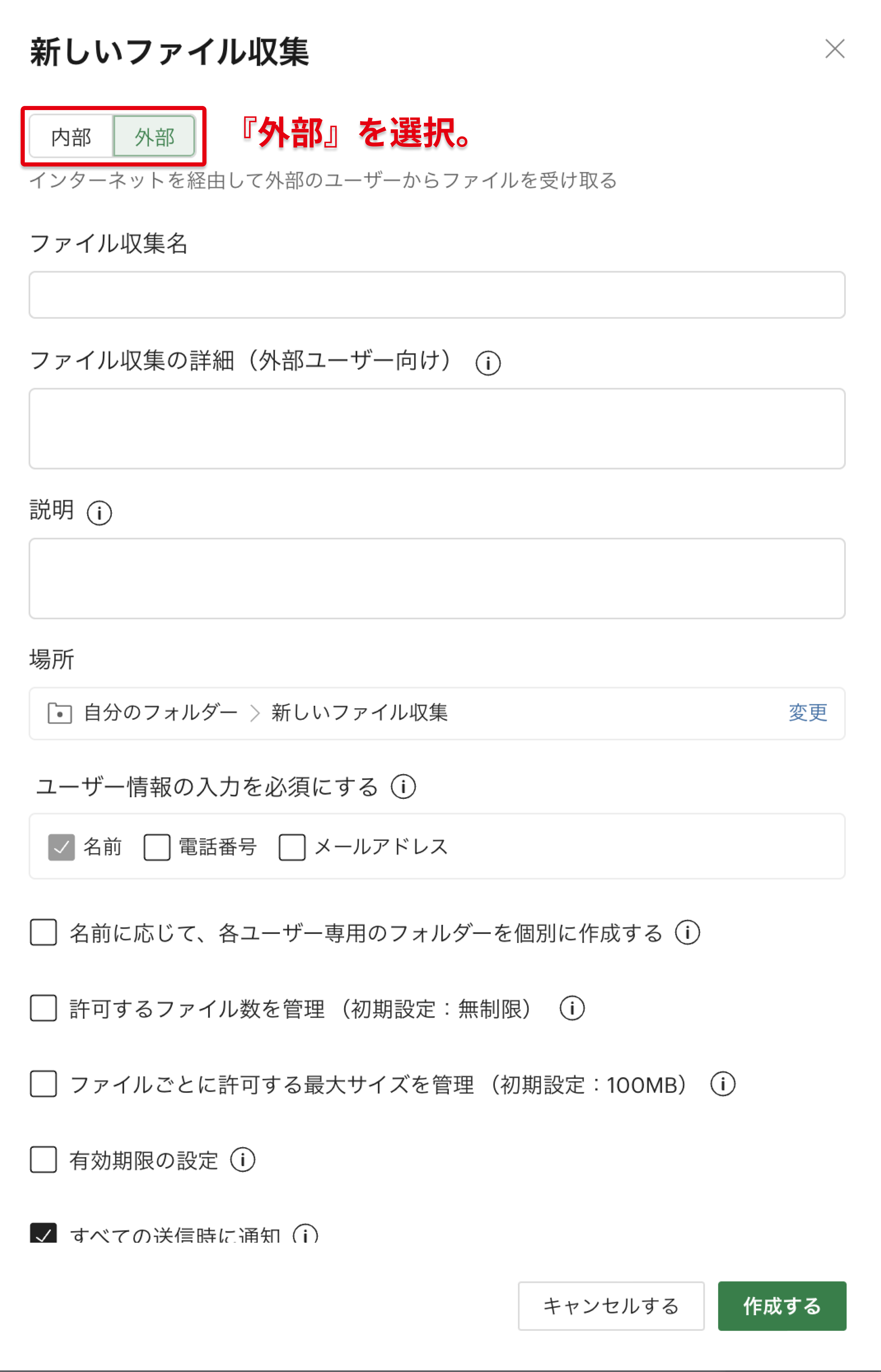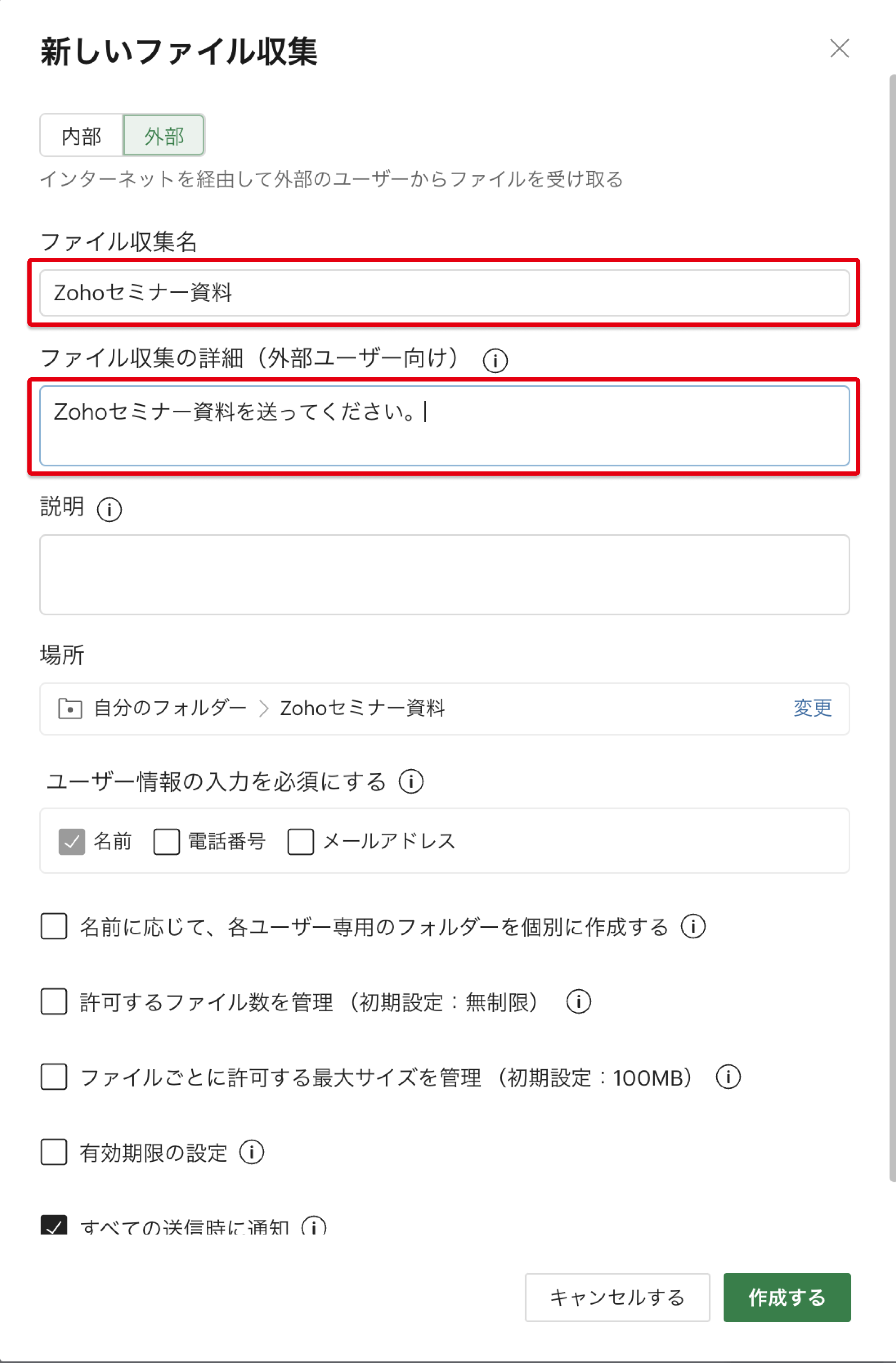 『ファイル収集名』『ファイル収集の詳細(外部ユーザー向け)』を適宜入力します。